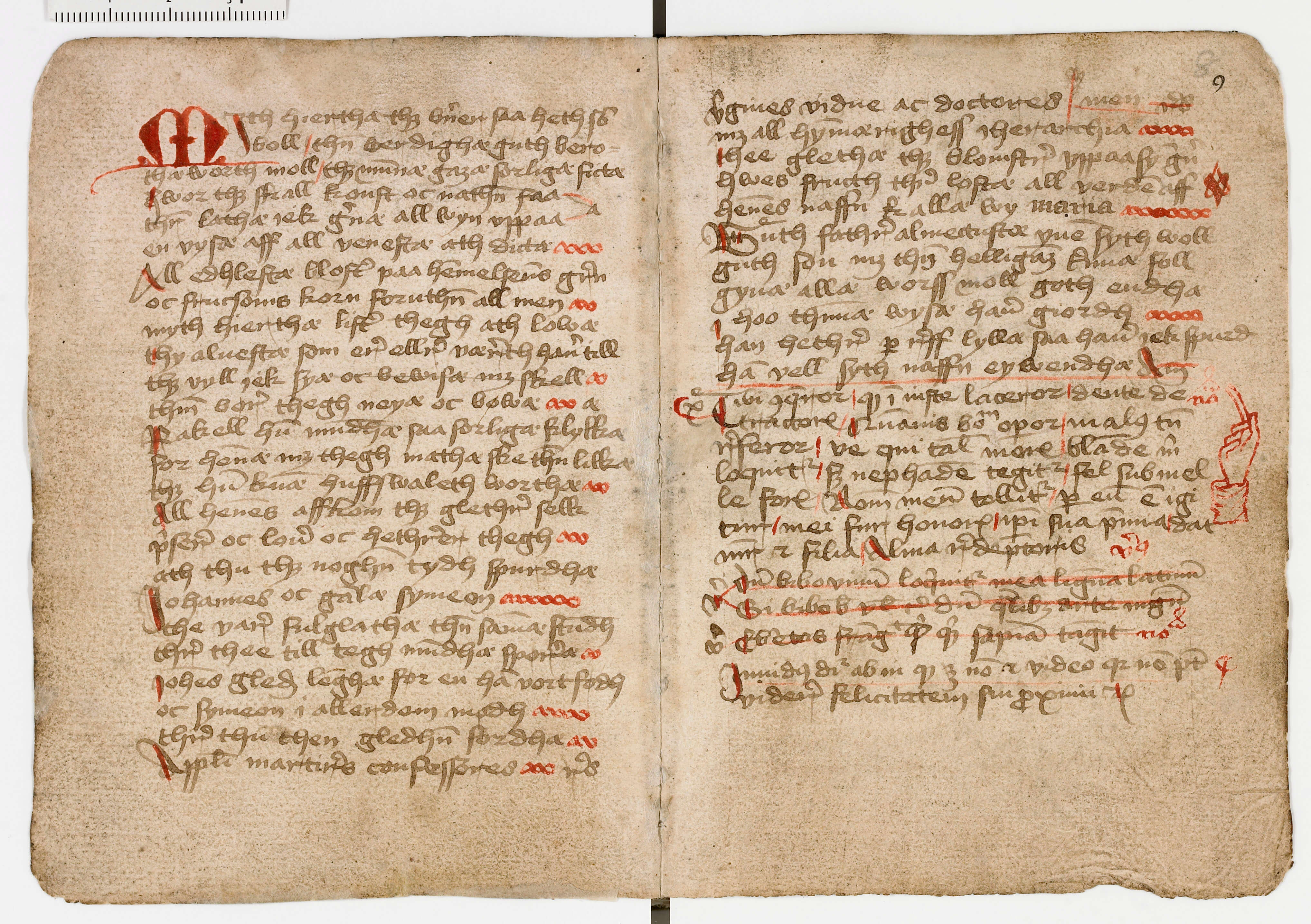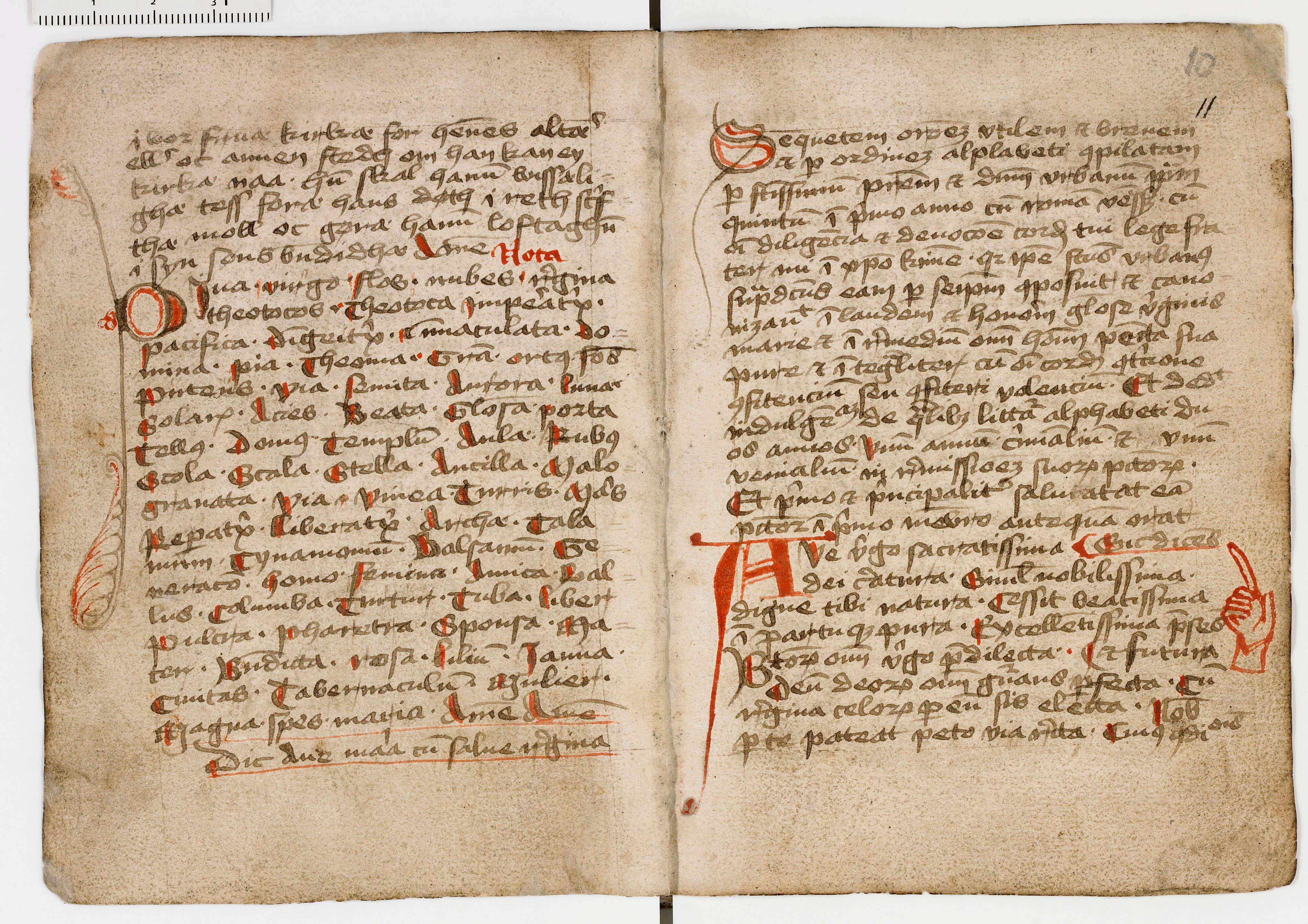 En rød hånd peger på begyndelsen af et akrostisk digt til Jomfru Maria. (AM 76 8vo, bl. 11r. Foto: Suzanne Reitz. Klik for at se i fuld størrelse.)