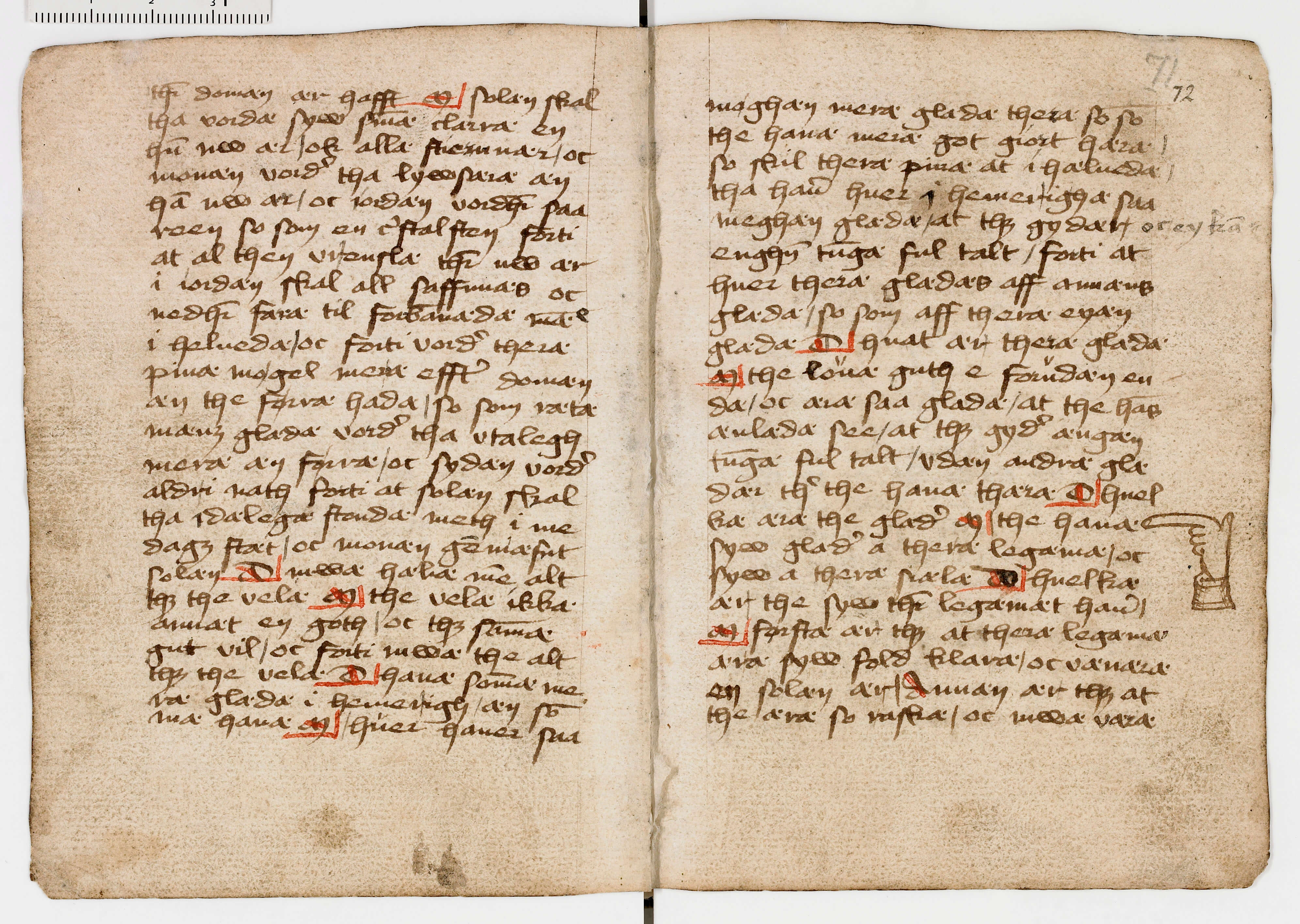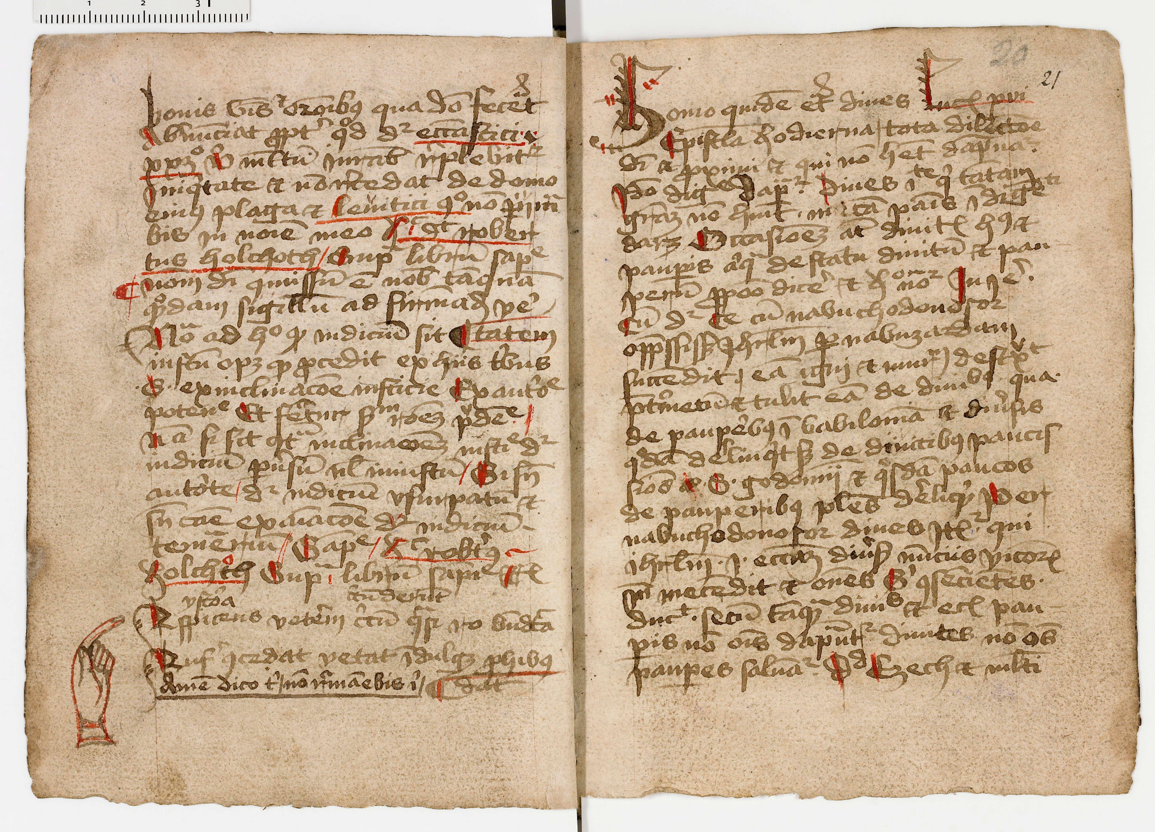 Seks maniculaer tegnet af forskellige hænder, fremtræder i margener i løbet af håndskriftet. De første tre fremkommer på bl. 9r, 11r og 20v. Når man kigger på dem samlet, dannes der et mønster: Alle tre peger på begyndelsen af et nyt værk. Den første manicula (bl. 9v), tegnet med rødt blæk, peger mellem linjerne 11 og 12, der hvor et digt til lovprisning af Jomfru Maria ender, og et digt om jalousi og druk begynder. Den anden manicula (bl. 11r), atter i rød, peger på åbningen af en akrostisk bøn til Jomfru Maria på linje 17. Teksten, som kommer før bønnen, slutter egentlig på foregående side, men lige foran bønnen findes en indledning, der tilskriver bønnen til Pave Urbanus 5., som også udskrev aflad. Maniculaen afhjælper forvirring, idet den peger på bønnens begyndelse. Den tredje manicula (bl. 20v), denne gang i både rødt og sort blæk, peger på linje 20, hvor et kort afsnit om huskeregler begynder. I alle disse tre tilfælde er overgangen fra den ene tekst til den anden ikke ligefrem klar – maniculaerne hjælper med tydeliggørelsen af teksternes opsætning.