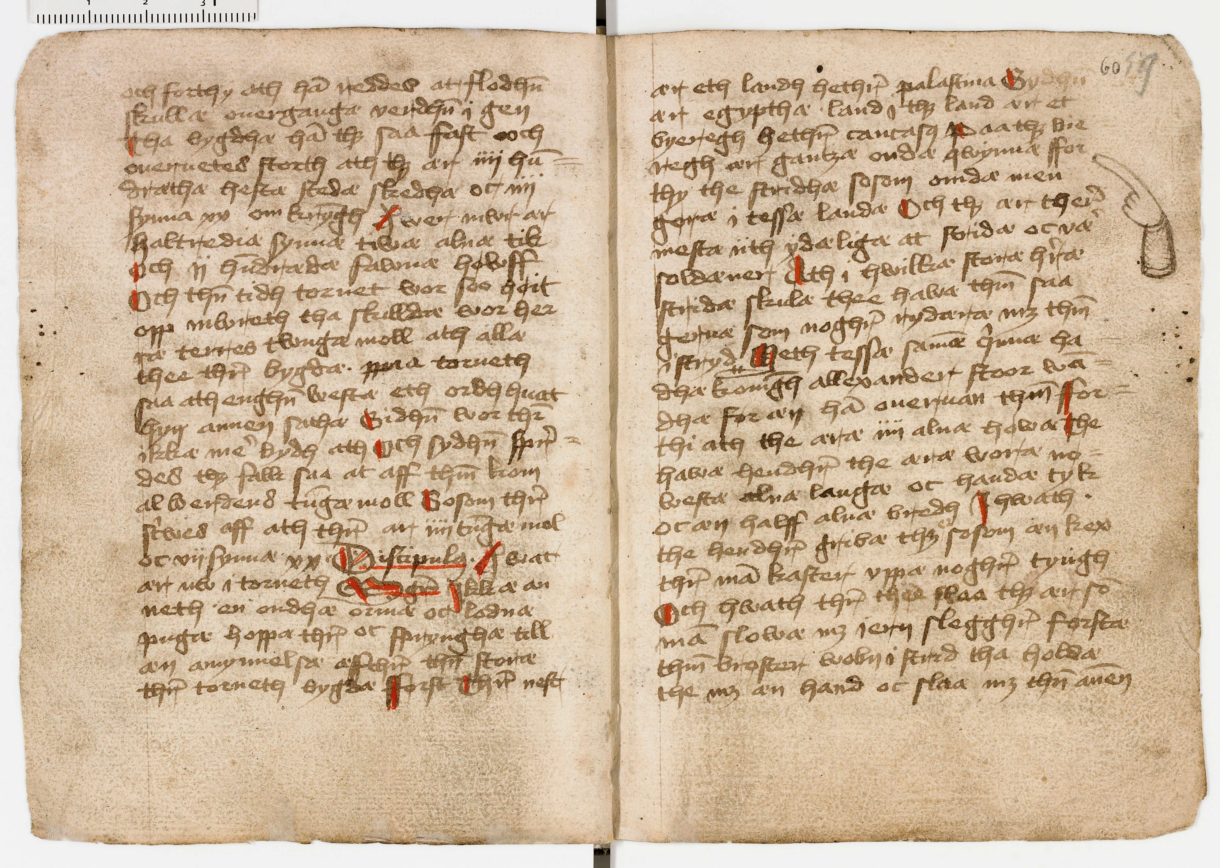En hånd med krydsskraveret ærme peger på Lucidarius. (AM 76 8vo, bl. 60r. Foto: Suzanne Reitz. Klik for at se i fuld størrelse.)